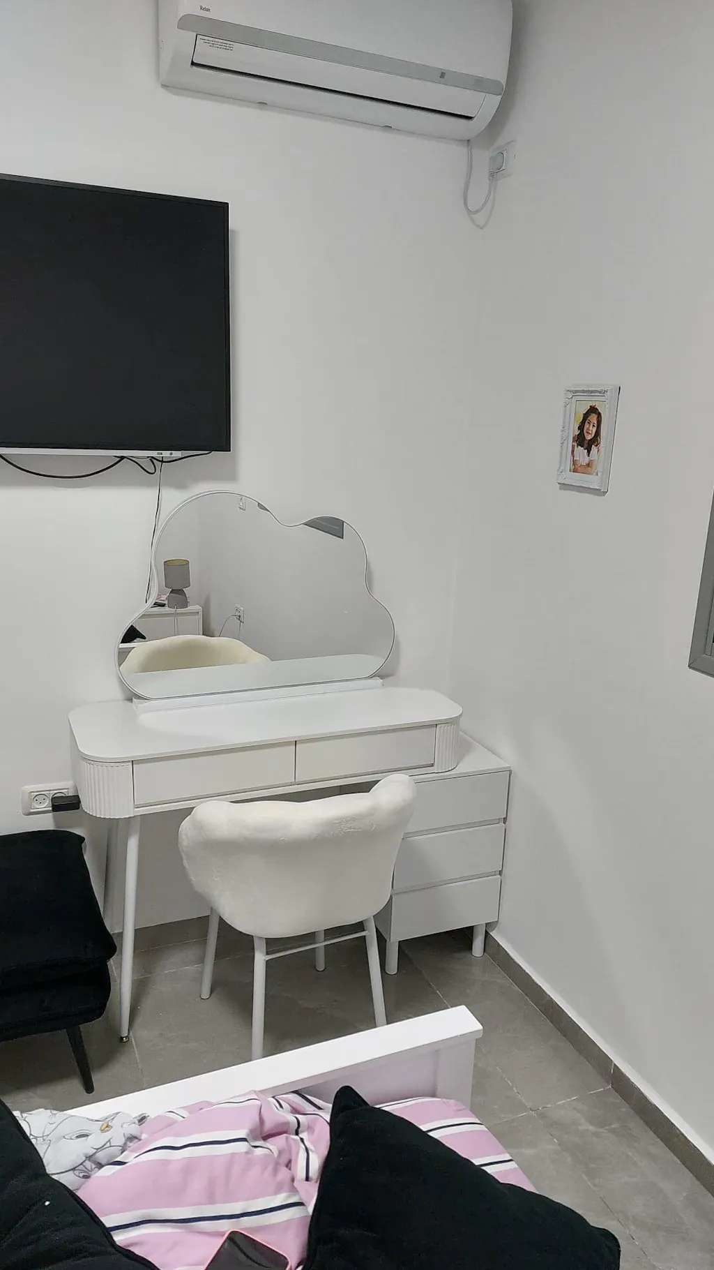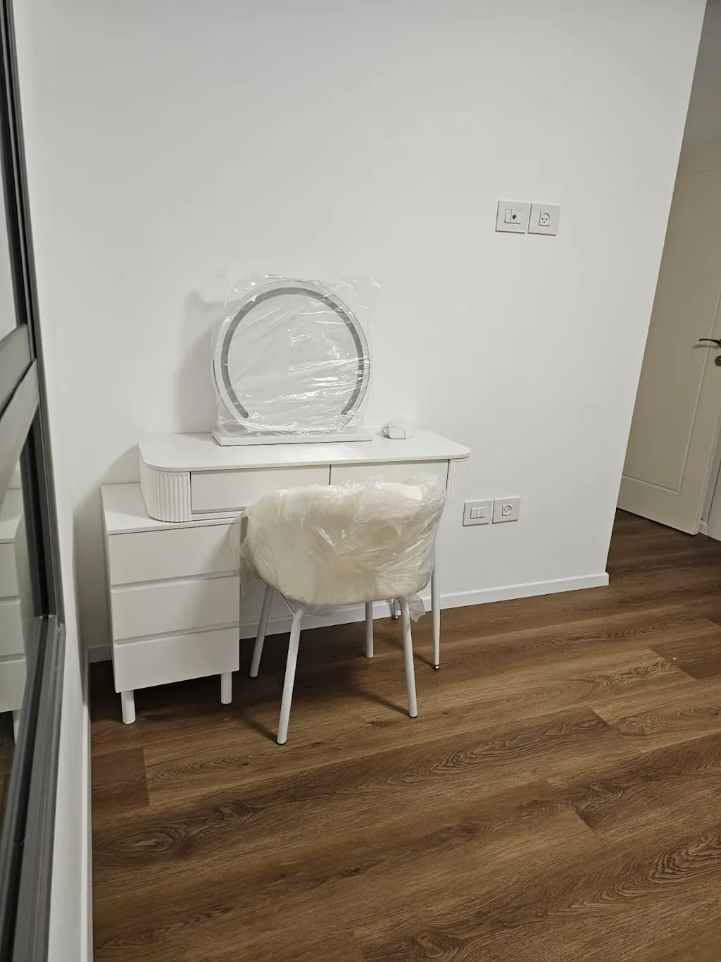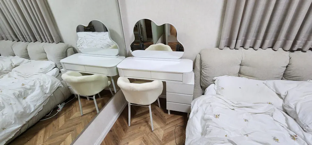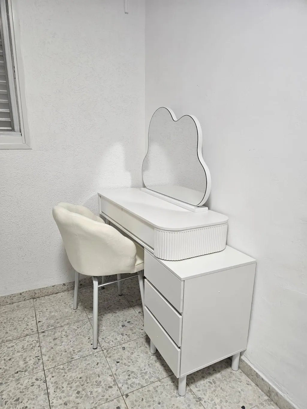 שידת איפור לבנה יוקרתית עם שידת צד כולל כסא ומראה דגם סקיי