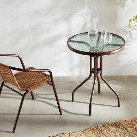 שולחן עגול למרפסת בצבע חוםקוטר 60 דגם רומא המחיר המשתלם ביותר בישראל! ✅ שולחן זכוכית מחוסמת ואיכותי עם רגלי מתכת מעוצבות וייחודיות ✅ עיצוב מודרני ואלגנטי שמתאים לכל חלל ✅ יציב במיוחד, קל לניקוי ותחזוקה...